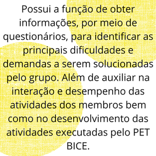 Além dos projetos e eventos que o PET BICE desenvolve, existem comissões internas para avaliar, divulgar e organizar todos os trabalhos executados, assim como a Comissão de Avaliação.